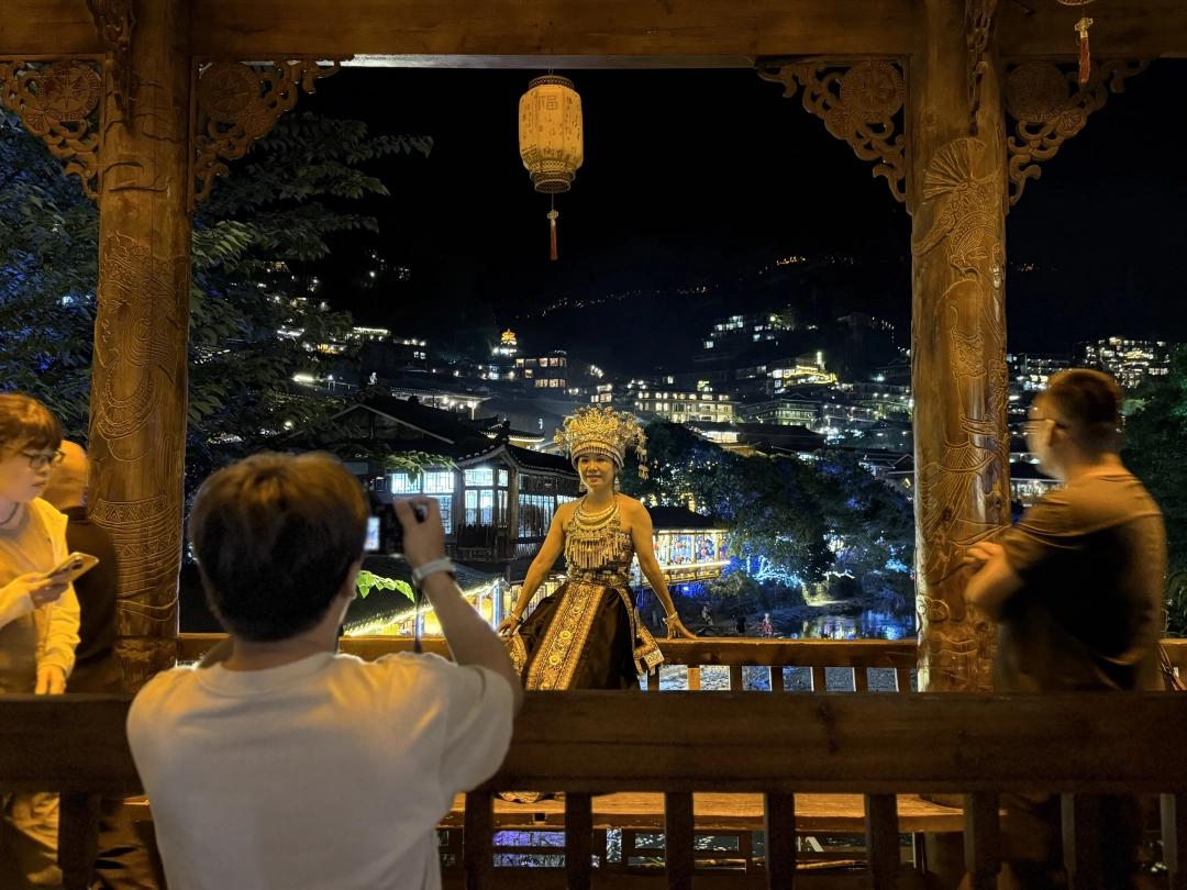 入秋以来,西江千户苗寨推出一系列沉浸式民俗体验项目,引导游客从“观看者”转变为“参与者”。除了经典的拦门酒、“高山流水”迎宾礼等传统仪式,景区还推出苗族风情旅拍服务,并将“游方对歌”、芦笙舞等原生态歌舞展演常态化,让游客在互动中感受苗族文化的魅力。